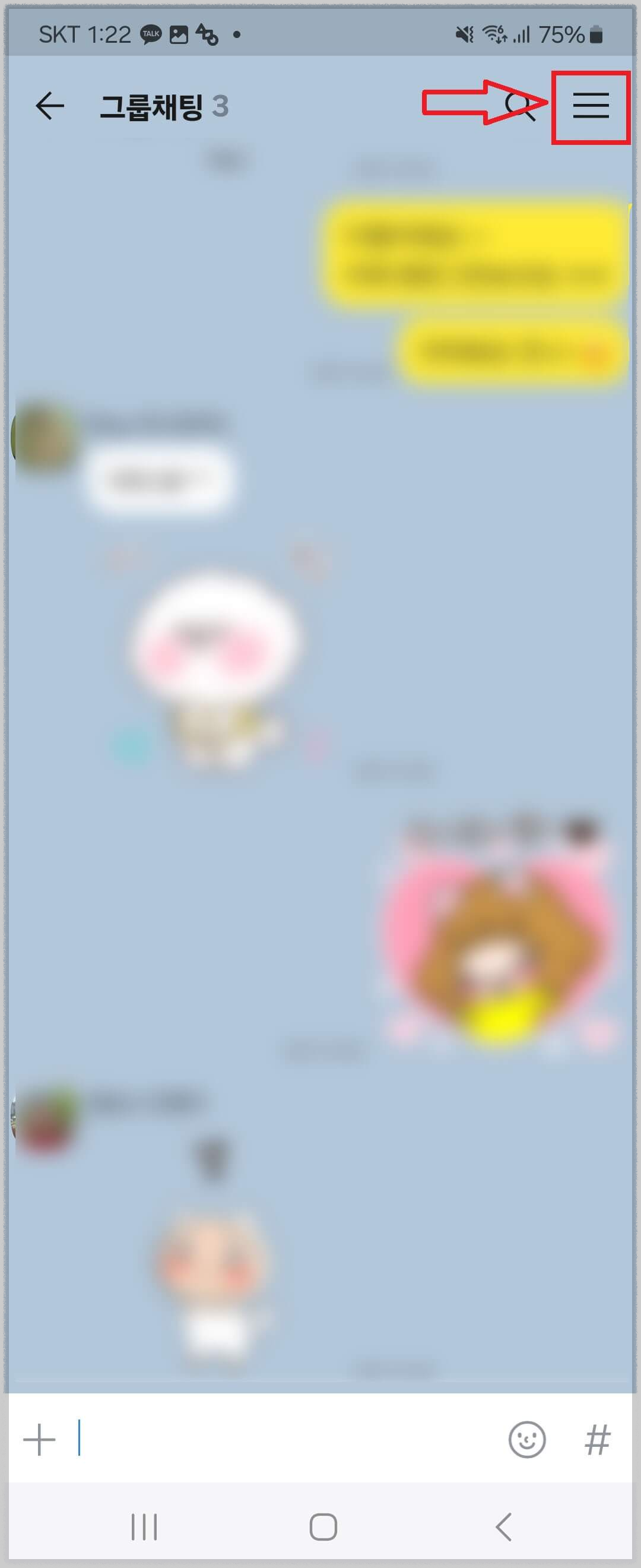 채팅방 화면 우측 상단에 위치한 세로 선 세 개의 아이콘(더보기 메뉴)을 클릭합니다.