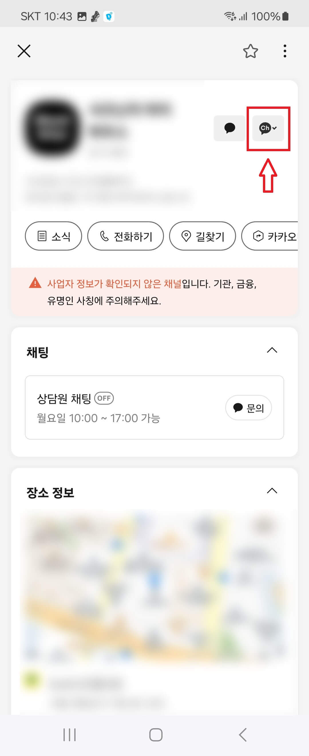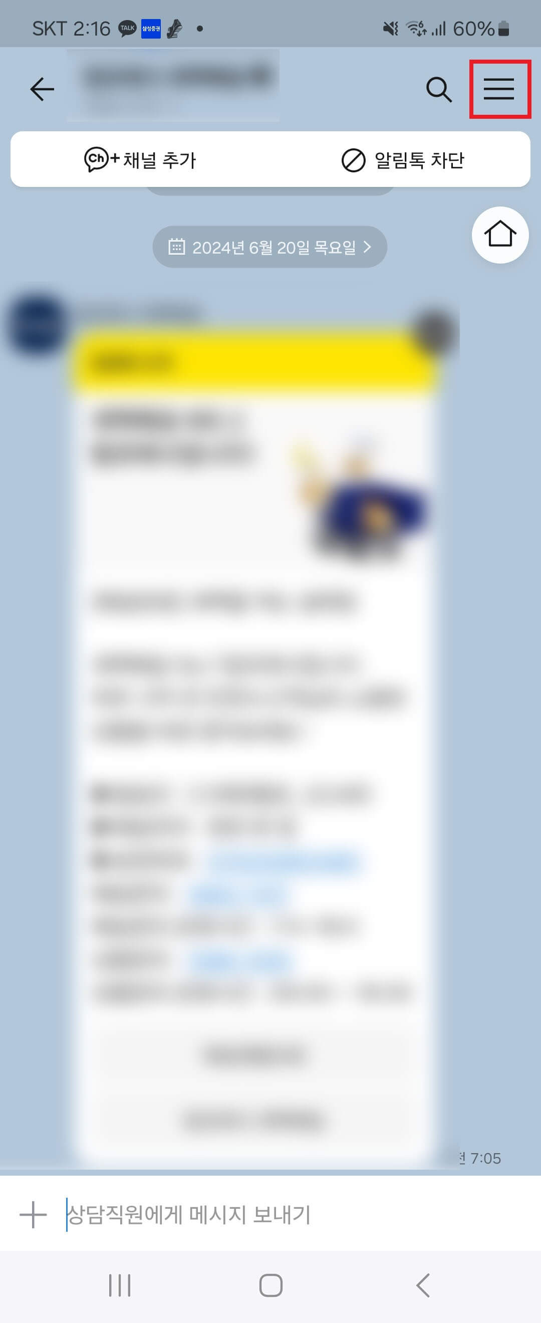 3. 차단하고 싶은 카카오톡 플러스친구 채널 방을 선택하여 대화방으로 들어갑니다.