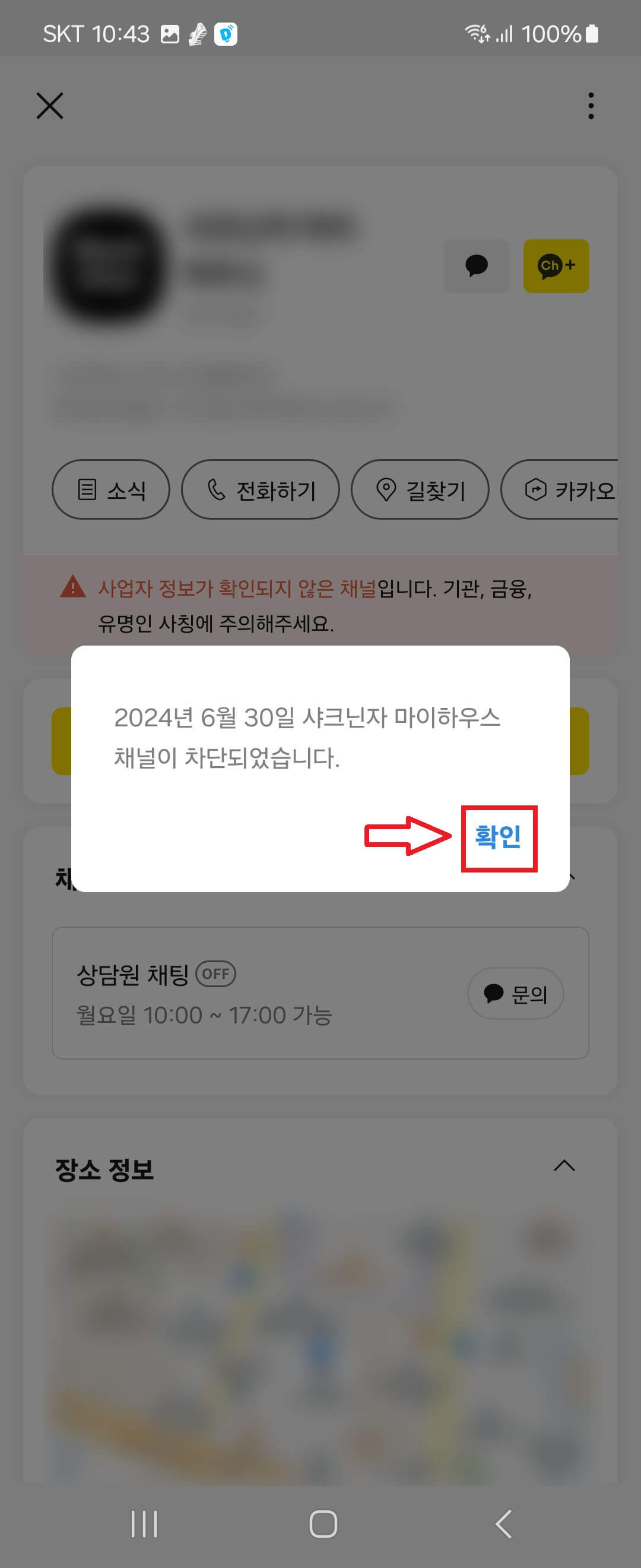 7. 채널 차단 메시지가 나오면 '확인'을 눌러주시면 차단 완료입니다.